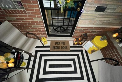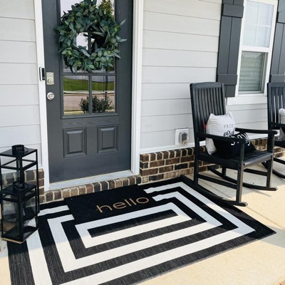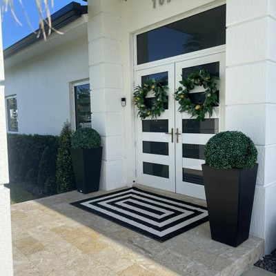 This rug, size and pattern, works perfectly for my front door entrance. The contrast of the white and black adds a modern touch. Pairs well with potted green plants and a bench.