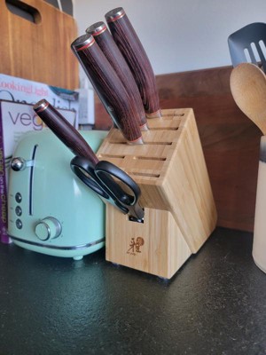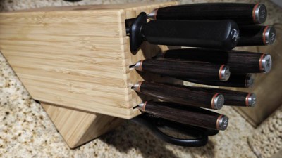 [This review was collected as part of a promotion.] Sharp knife set! The handle shape and balance make cutting easy. The knife block has extra slots for the 4pc. steak knives. Definitely worth the money!!
