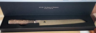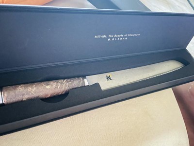 Miyabi never disappoints! This 9.5" bread knife will stay sharp and last a lifetime. The 133 layers of Damascus steel is always stunning to see, and stays durable and rust free. Ice-hardened so stays looking great and performing perfectly for years.