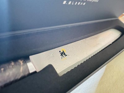 Miyabi Black is wonderful line within the Miyabi collection of Japanese kitchen knives. The extra length is a real bonus and the damascus finish really catches your eye. True Japanese cuisine may not involve bread but this knife works well with fruits or vegetables with a rind or a tough outer skin. The serration works nicely on western style crusty bread too, to reflect its name.