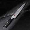 This 9.5" MIyabi Evolution is handcrafted in Japan, fabricated from revolutionary FC61 fine carbide steel, Ice-hardened FRIODURx2 blade offers exceptional durability, cutting edge retention, and corrosion resistance. Depending of the food size, this length is perfect for slicing and carving roasts meat, vegetables and fruits. It a go-to knife for daily cutting needs, it is scalpel-like sharpness, precision and the elegance of artistic cutting. Time-tested German engineering meets Japanese craftsmanship. Damascus smokey look on the blade prevents food from sticking to the knife, comfortable handle and durable.