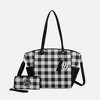 Karlie Tote Bag a perfect mix of classic style and modern flair. Vegan leather in a chic plaid with colorful trim, smooth top handles, and gold-tone details. Inside - Spacious and fully lined with all the pockets for your essentials. Outside - More pockets and a sleek back zip. Plus, an adjustable crossbody strap when you want to switch it up. And don’t forget the round M emblem, tassel keychain, and a matching wallet.