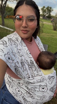 Got this after the boba wrap because it was so hot and I wanted a lighter weight material - Moby definitely delivered! I took my son for a walk with a friend, we ended up doing 3.2 miles and he slept the whole time. It was hot, but the Moby didn't overheat me! I also adore the Winnie the Pooh design!