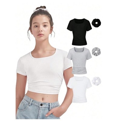 Mocamel Girl's 3-piece Square Collar Side Waist Pleated Short Top Simple Slim T-shirt