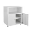 This versatile metal printer designed with a sturdy metal frame, it offers ample storage with an adjustable shelf and a convenient cabinet door. The stand is mobile, featuring four universal wheels for easy movement, with two lockable for stability. Ideal for holding heavy-duty printers or copiers, this compact unit is suitable for use in conference rooms, offices, or next to desks.