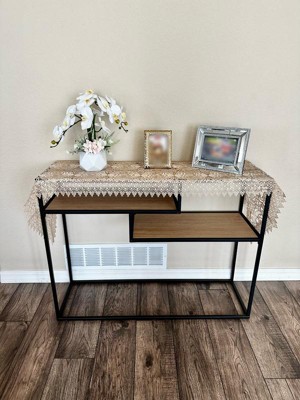 Saracina Home’s Modern 3-Tiered Console Table is a sleek and stylish addition to your urban entryway or living room. The black finish of the slim metal frame beautifully balances the warm wood texture of the tabletop and two shelves. Place eclectic decor, a key bowl, or travel souvenirs on display within the open storage frame to show off your style. The asymmetrical tiers contrast the boxy silhouette while remaining orderly, perfect for minimalist decorators. Overall Product Dimensions:Height: 32-1/4" (81.7cm)Width: 42" (106.5cm)Depth: 13" (33cm)Top Shelf Dimensions:Height: 5-3/8” (13.8cm)Width: 25-1/4” (64cm)Bottom Shelf Dimensions:Height to Top Shelf: 5-3/8” (13.8cm)Height to Tabletop: 11-1/2” (29.2cm)Width: 25-1/4” (64cm)Base Dimensions:Height: 18-5/8” (47.2cm)Base to Top Shelf: 24-5/8” (62.6cm)Width: 40-3/4” (103.3cm)Depth: 11-3/4” (29.8cm)Body Dimensions:Base Thickness: 5/8” (1.6cm)Top Surface Thickness: 5/8” (1.6cm)Base to Top Surface Height: 30-3/4” (78cm)Weight Capacities:Top Surface: 90 LBSShelves: 30 LBS