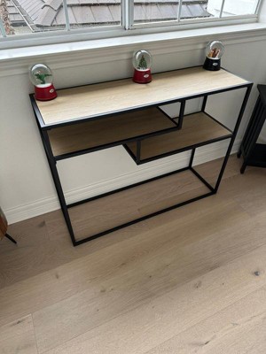 Saracina Home’s Modern 3-Tiered Console Table is a sleek and stylish addition to your urban entryway or living room. The black finish of the slim metal frame beautifully balances the warm wood texture of the tabletop and two shelves. Place eclectic decor, a key bowl, or travel souvenirs on display within the open storage frame to show off your style. The asymmetrical tiers contrast the boxy silhouette while remaining orderly, perfect for minimalist decorators. Overall Product Dimensions:Height: 32-1/4" (81.7cm)Width: 42" (106.5cm)Depth: 13" (33cm)Top Shelf Dimensions:Height: 5-3/8” (13.8cm)Width: 25-1/4” (64cm)Bottom Shelf Dimensions:Height to Top Shelf: 5-3/8” (13.8cm)Height to Tabletop: 11-1/2” (29.2cm)Width: 25-1/4” (64cm)Base Dimensions:Height: 18-5/8” (47.2cm)Base to Top Shelf: 24-5/8” (62.6cm)Width: 40-3/4” (103.3cm)Depth: 11-3/4” (29.8cm)Body Dimensions:Base Thickness: 5/8” (1.6cm)Top Surface Thickness: 5/8” (1.6cm)Base to Top Surface Height: 30-3/4” (78cm)Weight Capacities:Top Surface: 90 LBSShelves: 30 LBS