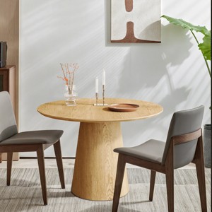 This high-end dining table features a unique wooden base design that not only enhances its visual appeal but also increases stability, ensuring long-lasting reliability. The spacious round tabletop is perfect for family dinners or gatherings with friends, fostering connection and creating memorable moments. The Nordic-inspired design, with its clean lines and natural wood grain patterns, adds an artistic touch, elevating the overall aesthetic of your dining area.