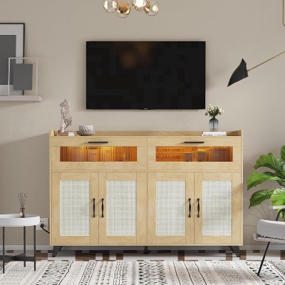 Modern Buffet Cabinet with Power Outlet & LED Lights - 4 Rattan Door Storage Sideboard with 2 Acrylic Drawers