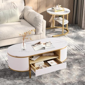 Modern Fluted Coffee Table, 48'' Modern Oval Coffee Table with Drawer, Faux Marble Top, Curved Profile Center Table with Storage, Gold Metal Decor, Center Table for Living Room