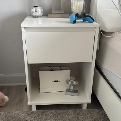 I was really tired of my small nightstand and didn’t feel like dropping two hundred plus dollars on one. I came across this one and liked the overall aesthetic and felt it would be easy to make look cozy and cute. I was very nervous after reading some of the negative reviews, I was worried it would fall apart, or that we wouldn’t be able to put it together. There were a few slightly confusing directions but nothing we weren’t able to figure out and overall it took about an hour to finish. Most of the pieces are pretty thick and sturdy, the only parts that felt a little cheaper/flimsier to me were the back and the bottom of the inside of the drawer, however the back piece didn’t bother me afterwards since you can’t see it. After putting my things in the drawer it held up fine and I didn’t have any issues! I think for the price it’s a cute nightstand and I was pleasantly surprised with how much bigger it seemed in person and the amount of space both on top and in the drawer. It’s definitely not the highest quality nightstand out there, but it’s pretty decent if you’re looking for a more affordable option.