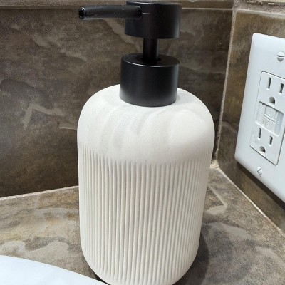Keep your bathroom decor clean, fresh and organized with the Modern Resin Sand Collection from Threshold™. This resin bath accessory collection includes a canister, soap pump and a toothbrush holder. All the pieces in this bathroom collection are adorned with a ribbed pattern to elevate the look of your bathroom with a touch of modern texture, while their natural-looking sand shade blends effortlessly with any style of decor. The canister with a lid keeps cotton balls, swabs, and makeup accessories secure and dust-free, while the toothbrush organizer with a black divided section easily holds your toothbrushes, toothpaste, hairbrush or a comb. The cylindrical soap dispenser is great for filling with your favorite hand wash or moisturizer, and it comes with an easy-to-use top pump in a matte black finish that helps you get the right amount of soap or lotion every time.