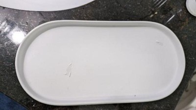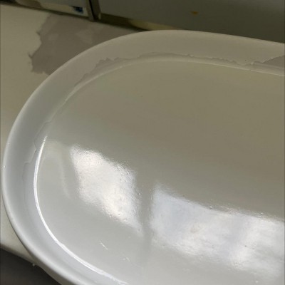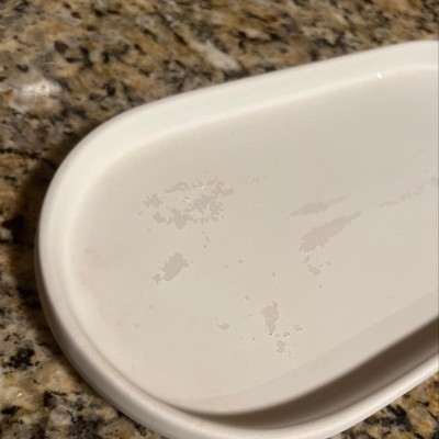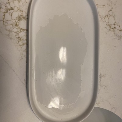 This tray is plastic coated, not glazed ceramic. Wish I would have know this when I bought it in store. It’s begun peeling off and is also staining. Super low quality and a terrible purchase. Wish I could return. These photos show it freshly washed; it’s truly stained.