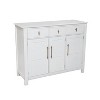 Upgrade your home organization with the ModernLuxe Storage Cabinet. Crafted from durable acacia wood and plywood, this large cabinet offers both style and functionality. The spacious desktop is perfect for displaying decorations, a microwave, or coffee machine. Inside, three drawers and three cabinets with adjustable shelves provide smart storage solutions. Featuring modern gold-tone handles and a clean white finish, this piece adds a contemporary touch to any space. Easy to clean with just a mild soap and cloth.