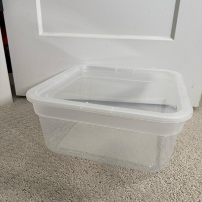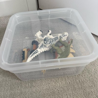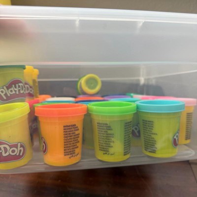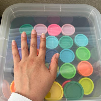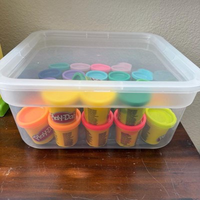 [This review was collected as part of a promotion.] I’ve been trying to get my children’s playroom under control and have been buying a ton of different storage items. This medium sized clear bin was perfect for storing their play doh. It looks much nicer than a bright cardboard box and it fits a ton of them. It fits the small play doh cans in a double row.