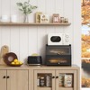 - [Stylish Design & Kitchen Counter Decor] The large bread box looks traditional yet modern and it is an accent décor on your counter top. The 2 door roll up bread box with frosted window that you can see what is in the box and wood handle with magnetic latch keeps the door securely closed. The flat top shelf with lip which can hold cans, spice jars, small kitchen appliances, or anything else that helps store more stuff in the same amount of kitchen space.