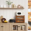 - [Versatile Kitchen Counter Organizer] The farmhosue bamboo bread holder can not only for breads, but also a clean and good place for holding snacks, fruits, cups, pills and other things. And the shelf on the top of bread box adds more counter storage space, you can put spices and other kitchen accessories on it, keep your counter clean and neat.