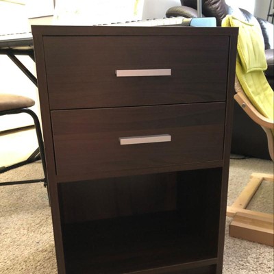It's a nice nightstand, looks pretty high quality once constructed. Dimensions are as advertised. There are quite a few pieces to assemble; it's not super difficult at all, but it would have been nice it the pieces had been labeled like some others products offer to keep track of which piece goes where. My only complaint is that the only thing that keeps the drawer from coming out once assembled is a peg. While it prevents the drawer from falling out of the stand, it does still fall without you even opening very far so if you plan to use the drawers often, that may be a deterrent. It would irritate me.