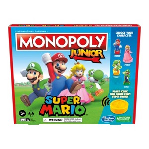 The Monopoly Junior game teams up with Super Mario characters and themes for action-packed excitement! In this Monopoly Junior: Super Mario Edition board game kids can imagine taking a fun adventure through the Mushroom Kingdom. They can choose to play as Mario, Peach, Yoshi, or Luigi, and move around the gameboard buying up properties and collecting coins. Players roll the power-up die to see if they get to press the Coin Sound Unit to hear the iconic coin sound from Super Mario, and to collect coins. This fun game for kids makes a great birthday or holiday gift for Super Mario fans and kids ages 5+.