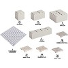 - Pieces include 24 - 1”x1” stacker, 16 - 1”x2” stacker, 6 - 1”x4” stacker, 6 - 2”x2” stacker, 1 - 12” stackable base plate, 30 - 1”x1” unpainted wavy tiles, 30 - 1”x1” unpainted ripple tiles, 30 - 1”x1” unpainted cracked tiles, and 30 - 1”x1” unpainted cobblestone tiles