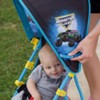 Ride in style with the Monster Jam Stroller! This compact and lightweight stroller is perfect for on the go families, featuring a bold Monster Jam design that will have your child revved up and ready to roll. The big BKT tires offer a smooth ride along different terrain, while the rear wheels feature toe tap locking brakes to keep the stroller in place when parked. Equipped with secure safety straps and removable canopy to protect your little one from the elements. Suitable for kids 6 months and up, they'll be ready for any adventure that comes their way.