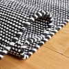Crafted in India, a land renowned for its rich heritage in textile artistry, this flat weaved rug boasts exceptional craftsmanship. The intricate pattern adorning the borders, seen in the image, reflects a blend of traditional motifs with a contemporary aesthetic, set against a striking black and ivory color palette.