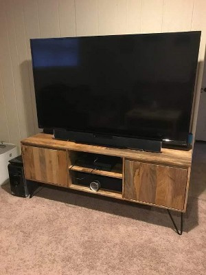 Clean-lined design meets industrial chic with the Moreno 60” TV Media Stand. Hand crafted with a combination of solid Mango Wood and sturdy metal hairpin legs. The open shelving and hidden storage compartments make it easy to stay organized and wire free. Ideal for storing DVD favorites and media accessories. Perfect for TV’s up to 65 inches this media unit brings function and style to any den or living room.