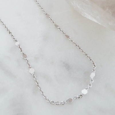 A whisper thin chain spotted with tiny discs. This delicate necklace lends the perfect amount of shimmer against your neck. This delicate piece is gorgeous worn solo as it is layered alongside your favorite chains and necklaces. Length: adjustable between 14" - 17.5". Our Necklaces are plated with 18k gold, 18k rose gold, or rhodium and finished with a protective coating. A little secret we'll keep between us: it looks way more than it costs.