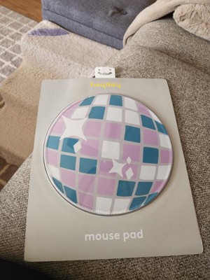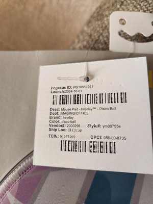 The Heyday™ Disco Ball Mouse Pad measures 8 inches long by 8 inches wide. It's the perfect size to place your mouse on. It allows enough room for you to move your mouse around freely, without taking up too much room on your workspace. The back side of the mouse pad has a rubber backing that helps the pad stay in place once you set it down. There is no slipping and sliding of the pad. The front is made of polyester and is nice and smooth. My mouse rolls over it with no hang-ups or issues. Both sides are stitched together well. The pad is lightweight, yet it's very durable. I like the colors of the disco ball design. It gives my desk a pop of color. I like that this mouse pad comes with a one-year warranty.