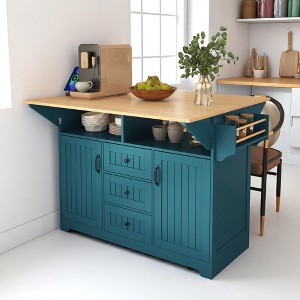 This Rolling Kitchen Island with Dual Drop Leafs is designed for modern living. Its multifunctional design allows you to fold, expand, or move it easily depending on your needs. Equipped with a power outlet, towel rack, spice rack, drawers, and cabinets, it offers exceptional utility in one compact unit. The smooth tabletop doubles as a prep or dining surface for up to four people. With its farmhouse aesthetic and practical functionality, this island is the perfect blend of style and convenience for any home kitchen.
