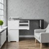 - Additional storage includes open shelves and two movable side layers under the rotating top, allowing customized organization.