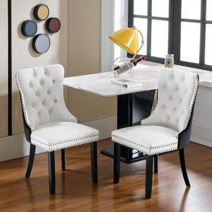Elevate your dining experience with this set of two high-end modern dining chairs. Featuring a unique blend of PU leather and velvet upholstery, these chairs bring together luxurious texture and contemporary style. The handcrafted nailhead trim, elegant tufted backrest, and solid rubberwood legs make them both visually stunning and exceptionally durable—perfect for any modern or classic dining space.