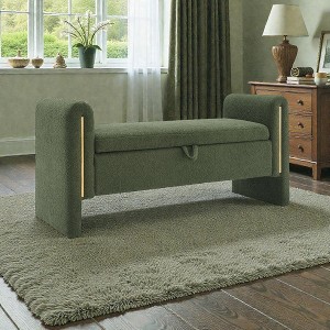 Upgrade your living space with this multifunctional upholstered storage bench, crafted to combine comfort, elegance, and practicality. Wrapped in soft teddy fabric and supported by a sturdy structure, this piece provides hidden storage while doubling as a vanity stool, window seat, or bed end bench. Metal decorative accents and neatly stitched seams add a luxurious touch to any room. Product Features