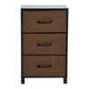 This 3-Drawer Storage Unit in Black Oak Wood Grain and Brown is made of a sturdy metal frame lined with an attractive wood laminate. Durable steel legs paired with high-quality wood finished in scratch-resistant wood grain laminate, cloth drawers, and plastic handles ensure longevity. These drawers are lined with a soft yet durable polyester fabric, each featuring a convenient handle. A great option for smaller living spaces, the drawers can be folded for storage. Standard assembly is required, and the drawers are solid and supported by wire backing. This unit fits Contemporary, Transitional, Modern, and Country styles, measuring 16.0 inches in length, 12.0 inches in width, and 25.75 inches in height.