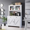 - Smart Dual-Purpose Design This innovative kitchen hutch combines a stable microwave stand with a dedicated coffee bar in one space-saving unit. The reinforced 100lb-capacity top shelf securely holds microwaves or air fryers, while the lower coffee station keeps brewing essentials organized. Perfect for compact kitchens, it eliminates countertop clutter while streamlining your morning routine.