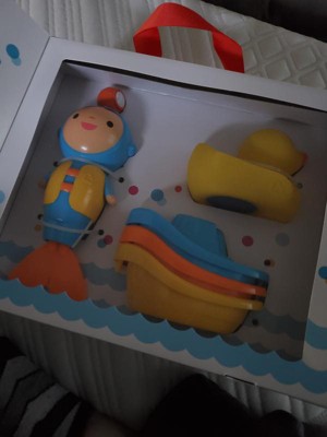 This was such a cute little gift set that my son loves! He enjoys playing with the little ducky, loves the little scuba guy that flips and flaps when you pull the thing on his head, and enjoys the stackable boats too! He even tries playing with them when out of the tub. A plus for parents is the awesome “hot indicator” on the bottom of the duck! If the tub is too hot the bottom of the duck will turn white and say hot! So helpful yet simple! I received this product in exchange for my honest feedback.
