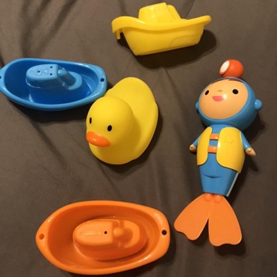 What I like most about the Munchkin brand is they are known for great safety features. There are a lot of bath sets out on the market but this one is way better and absolutely adorable. The rubber duck has a safety feature on the bottom that reads "hot" if the bath water is too hot for the baby. The accompanied toys include and a scuba diver and three boats for bath time fun & play. Overall, my baby enjoyed this bath set, especially the scuba guy. It's also great for a baby shower gift and a definite must have for any mom. And the rubber duck is mildew resistant. I highly recommend this premium bath set.