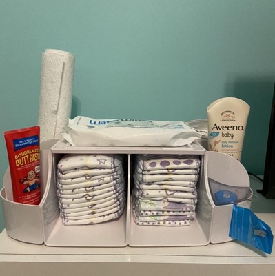 - Tabletop diaper station organizer holds diapers, wipes, ointments, bags and more