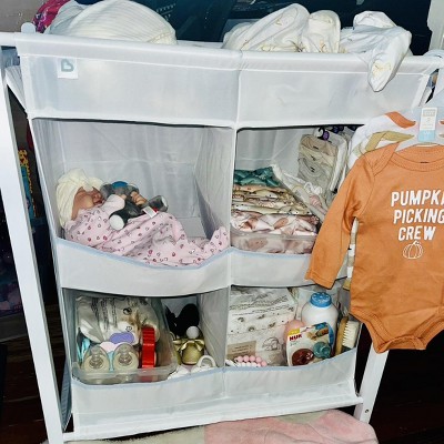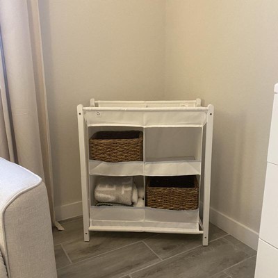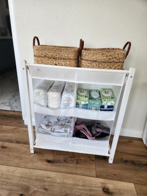 This wasn't very expensive but it was not worth even the low price. You could get better integrity by stacking a few cardboard boxes. The storage compartments are fabric and really thin cardstock so if you put anything that ways more than a few ounces it sags and looks very sloppy. Even just a few cloth diapers cause it to sag and it doesn't recover when you take the stuff out. I ended up drapong a swaddle down the front of it to hide the clutter because it does look very nice even when the items are neatly organized. Only gave it 2 stars because it was easy to assemble.