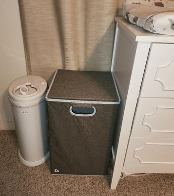 - Lightweight, large capacity baby laundry hamper with a folding lid that won't fall in