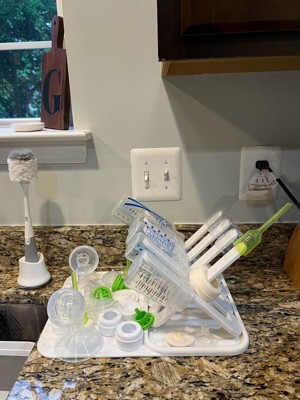[This review was collected as part of a promotion.] This bottle drying rack is okay but not my favorite. On the plus side, it is sturdy and dishwasher safe for maintenance cleaning. It also assembled easily. For drawbacks, it takes up a good amount of counter space and doesn’t fit as much as the Oxo drying rack. I pump at work and my baby uses three to four of the Dr. Brown’s bottles per day. I find that a day’s worth of bottles and pump parts ~just~ fit. The pump flanges and necks of the bottles are too narrow to go on the pegs, so those end up layered on the mat and don’t dry as efficiently. I think this might work better for us when my baby starts using cups and eating solids.