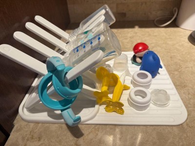 [This review was collected as part of a promotion.] I want to love this more but it’s just ok. The silicone while helps it not slip is a magnet for dust but it washes off easy enough. Bottles fit on it well enough, holds a decent amount of bottles & nipples. The extra mat is nice for other baby accessories you might wash but while it’s compact it won’t fit a lot on it. I have a different munchkin drying rack that holds more bottles and easier to fold up and store. I just prefer that one.