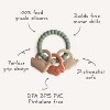 Help little ones explore sensory rich shapes and textures with a teething ring that features three prehistoric dino creatures. Made from 100% food grade silicone, teething babies will enjoy sinking their gums into the soft material that satisfies the natural urge to chew. Featuring four earthy colors and a raised leaf texture around the ring, this toy inspires playful moments and creates opportunities for discovery.