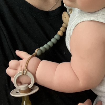 We love the Mushie pacifier clips! They’ve been so helpful for our babe! He loves to hold or chew on the beads and I love how they are easy to clean too!