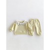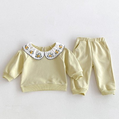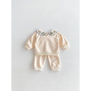 Introduce your little one to elegance with this versatile two-piece set. The top features delicate flower embroidery on the collar, while the solid color pants complete the chic look. Perfect for any occasion, this set is both stylish and comfortable for your baby girl or toddler.