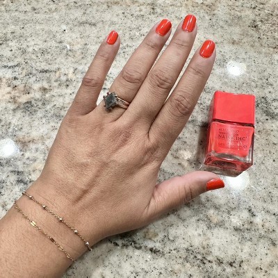 The orange color (Charlie) is a beautiful, deep, rich orange with red undertones. Streaky, took 3 coats for full coverage. Wears well, lasts almost 2 weeks. I wish target still carried this brand in store.