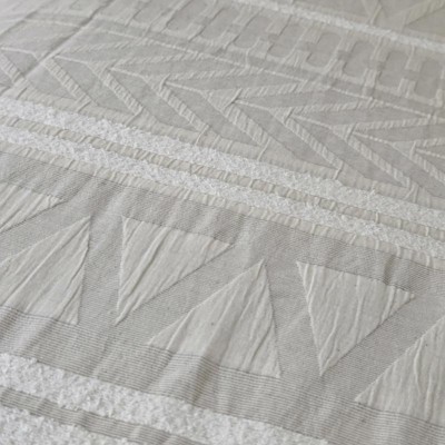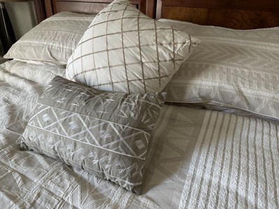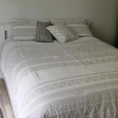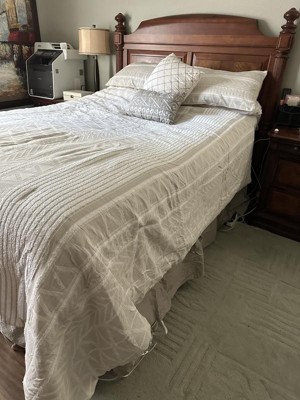 [This review was collected as part of a promotion.] I was looking for a comforter for the fall and winter season in California. It cools down a little but not enough to require a heavy comforter. This one is the perfect weight. I was looking for something neutral, but I did not want anything gray and I found this beige/cream set and I feel it’s very classy looking.. I have a queen bed and the comforter hangs nicely on each side is quite generously sized. It’s size is 90“ x 92“. It came complete with a bedskirt, two pillow shams and two decorative pillows. The fabric is nice and soft, not scratchy and has a nice striped and geometric pattern on it. I really do like this comforter set.