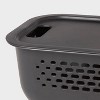 Stack and store your items in style with this Narrow Small Decorative Plastic Bin from Brightroom™. This black storage bin showcases a perforated design for a stylish look that blends effortlessly with any decor style. The multipurpose narrow storage bin is easy to stack and built-in handles make it easy to carry between rooms. You can place it on a shelf or desktop to keep items nicely organized.