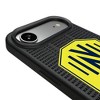 This stylish and practical case sports an officially licensed design and is MagSafe compatible. Ideal for fans, enthusiasts, and everyday users who want a slim, protective, and MagSafe compatible case. Premium black leatherette and anodized aluminum buttons ensure a comfortable grip and great tactile response. Precise speaker and port cutouts and integrated magnets optimize compatibility with accessories and wireless charging devices. It is drop-tested to 4.9 feet for a perfect balance between bulk and protection and is designed and decorated by Keyscaper in Tualatin, Oregon, USA.