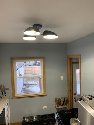 We bought this fixture to replace a 6’ track lighting we had in our kitchen. We had problems with shadows on our stove and countertops but the 3 lights are perfect for our kitchen shape. Well made fixture and easy to install. We bought 3 LED Edison type bulbs and they look great in it!